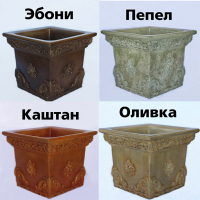 RAL classic (Фарбування виробів квітами з каталогу розраховується окремо та у вартість виробу не входить) - Сірий колір незабарвленого бетону. 1. Просочення. Вироби, пофарбовані просоченнями по бетону, мають чотири базові кольори: каштан оливковий попіл ебоні 2. Білий монохромний колір. Вироби, відлиті із застосуванням білого цементу, мають не білий колір, а трохи сірий. Ці вазони (назвемо їх світло-сірими), як правило, підходять до багатьох стилів і гармонують із великою палітрою кольорів. 3. Будь-який колір за RAL'ом. Вироби забарвлюються у будь-який обраний замовником колір за стандартною міжнародною системою кольорів RAL. Треба не забувати, що вибраний колір сприйматиметься на виробі інакше. Світлотіні, форми, рельєфи та розміри забарвленої площини спотворюють сприйняття обраного кольору. Використовуються лише фасадні фарби. Колір підбирається комп'ютером на машині для фарбування в салонах продажу фарб. 4. Сірий колір незабарвленого бетону. Такі вироби не фарбуються. Вони мають неоднорідний колір натурального бетону.