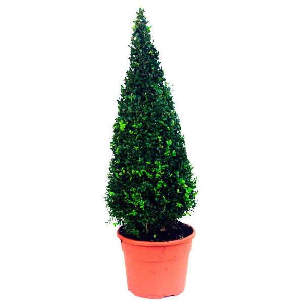 Самшит вічнозелений або букшпан (Buxus) - витончена кущова рослина сімейства Самшитових. Назва цього чагарника чудово підходить під його зовнішній вигляд. На грецькому "букшпан" означає "щільний". Саме так виглядає крона самшиту – щільне, густе зелене полотно. Форма: У природному середовищі він має розлогу конусну форму. Але завдяки своєму густому зростанню гілок і листя його можна формувати в будь-які зелені скульптури. Розмір: У віці 10 років самшит досягає 5 метрів заввишки та 2 у діаметрі (це за умов відсутності обрізки). Зростання повільне. Середній річний приріст трохи більше 5 сантиметрів. Листяка: Дуже м'ясиста, щільна. Листя розташоване симетрично на гілки, росте густо. Букшпан не скидає листя в холодну пору року. Коренева система: Глибока і добре розгалужена. За рахунок поглибленості коренів, самшит відмінно переносить сильні вітри та промерзання ґрунту. Тому підходить для посадки у будь-яких регіонах. Рекомендації з посадки: Чагарник невибагливий до умов зростання. Грунт може бути будь-який, крім кам'янистої. Слід уникати надмірної зволоженості ґрунту – це може сприяти загниванню кореневої матки. Лунка для посадки за розмірами має відповідати земляному ком саджанця самшиту. У посадкову яму для кращого вкорінення часто додають торф і дерен. Догляд: Це дуже вологолюбний чагарник. Його потрібно регулярно обприскувати для зволоження листя та пагонів. Полив помірний, у міру висихання ґрунту. Добрива вносяться двічі на місяць у період активного зростання і 1 раз на 30 днів після настання періоду спокою. Особливості: Це ідеальна рослина для топіарної стрижки. Фахівці можуть надати чагарнику практично будь-яку форму: геометричну, арочну, фігурну тощо. Використання в дизайні: Самшит у ландшафтному дизайні вважається улюбленою рослиною декораторів. З нього легко створюються живоплоти та зелені скульптури. За допомогою букшпану прикрашають альпінарії, розарії, квітучі клумби. Рослина сформована у вигляді конуса. Висота рослини 90-100 см