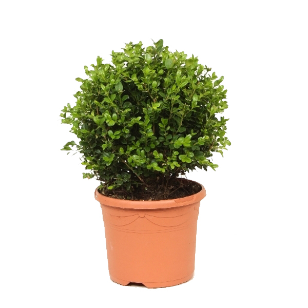 Самшит вічнозелений або буксус (Buxus) - витончена кущова рослина сімейства Самшитових. Назва цього чагарника чудово підходить під його зовнішній вигляд. На грецькому "букшпан" означає "щільний". Саме так виглядає крона самшиту – щільне, густе зелене полотно. Форма: У природному середовищі він має розлогу конусну форму. Але завдяки своєму густому зростанню гілок і листя його можна формувати в будь-які зелені скульптури. Розмір: У віці 10 років самшит досягає 5 метрів заввишки та 2 у діаметрі (це за умов відсутності обрізки). Зростання повільне. Середній річний приріст трохи більше 5 сантиметрів. Листяка: Дуже м'ясиста, щільна. Листя розташоване симетрично на гілки, росте густо. Букшпан не скидає листя в холодну пору року. Коренева система: Глибока і добре розгалужена. За рахунок поглибленості коренів, самшит відмінно переносить сильні вітри та промерзання ґрунту. Тому підходить для посадки у будь-яких регіонах. Рекомендації з посадки: Чагарник невибагливий до умов зростання. Грунт може бути будь-який, крім кам'янистої. Слід уникати надмірної зволоженості ґрунту – це може сприяти загниванню кореневої матки. Лунка для посадки за розмірами має відповідати земляному ком саджанця самшиту. У посадкову яму для кращого вкорінення часто додають торф і дерен. Догляд: Це дуже вологолюбний чагарник. Його потрібно регулярно обприскувати для зволоження листя та пагонів. Полив помірний, у міру висихання ґрунту. Добрива вносяться двічі на місяць у період активного зростання і 1 раз на 30 днів після настання періоду спокою. Особливості: Це ідеальна рослина для топіарної стрижки. Фахівці можуть надати чагарнику практично будь-яку форму: геометричну, арочну, фігурну тощо. Використання в дизайні: Самшит у ландшафтному дизайні вважається улюбленою рослиною декораторів. З нього легко створюються живоплоти та зелені скульптури. За допомогою буксусу прикрашають альпінарії, розарії, квітучі клумби. Висота рослини: 25 см Діаметри рослини: 25-30 см