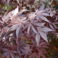 Клен віяловий (пальмолистий) Бладгуд (Acer palmatum Bloodgood) - декоративний, листопадний чагарник або невелике деревце з округлою кроною. У висоту досягає 4-6 м, ширину до 6 м. Повільно зростаючий. Листя: Супротивні, 5-10 см завдовжки і до 12 см завширшки, 5-7-лопатеві, розсічені до середини, краї злегка зазубрені, листові черешки довгі, до 5 см, забарвлення при розпусканні і все літо від темно-пурпурової до чорно-червоної, восени яскраво-червоної. Цвітіння: Цвіте після утворення листя у червні, квітки червонуваті. Плоди: Крилатки дуже декоративні, спочатку червоні, потім коричневі, розташовані під тупим кутом. Місцерозташування та грунт: Віддає перевагу півтіні, теплим місцям. Любить родючий досить вологий ґрунт. Добре росте на гумусних, слабо-кислих, дренованих ґрунтах. Використання: Чудовий сорт для невеликих садів, добре виглядає біля води, поряд з камінням у рокаріях. Ефектно виглядає як контейнерна рослина для терас, при вході в будинок або установу. Особливо цінується за ажурне листя, красу та витонченість крони та неймовірно інтенсивне забарвлення.