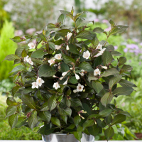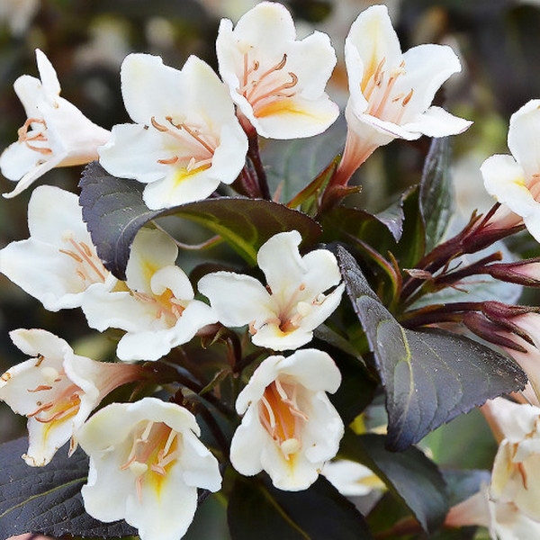 Вейгела Ебоні та Айворі - чагарник з гарним забарвленням листя та квітів. Кущ Ебоні та Айворі Виростає до 120 см заввишки і так само завширшки, у горщиках значно менше, близько 80 см заввишки. Повільнорослий, компактний, густий чагарник. Цікаве листя – коричнево-пурпурно-темно-зелене. Білі квітки зібрані у суцвіття – з'являються із червня.