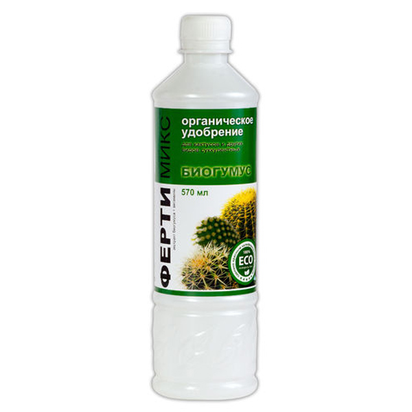 Фертімікс біогумус для кактусів - органічне добриво на основі біогумусу (продукту життєдіяльності червоного каліфорнійського черв'яка) для кактусів та інших суккулентних: - стимулює рівномірне зростання, - покращує декоративний вид рослин, - сприяє бутоноутворенню, - підтримує яскравість - Знижує захворюваність рослин. Біогумус - унікальне природне добриво, що поєднує в собі: - екологічну чистоту, - наявність ферментів та гумінових речовин, - оптимальний склад макро- та мікроелементів, - біологічну доступність усіх компонентів, - високу ефективність застосування, - пролонговане ( тривалий) дію. Спосіб застосування: Кореневе підживлення: Рекомендована концентрація добрив - 20 мл (3 ковпачки) препарату розчинити в літрі чистої води. Підгодовувати рослини в період росту один раз на два тижні. Обов'язково чергувати з мінеральним добривом. Область застосування: Не рекомендується удобрювати: хворі рослини, коли не встановлена причина хворобливого стану, рослини з постраждалою кореневою системою (коренева гниль, якщо рослина була сильно залита), на яскравому сонці або по сухій землі (перед підживленням) бажано зволожити ґрунт водою), в холодному приміщенні, на протязі.