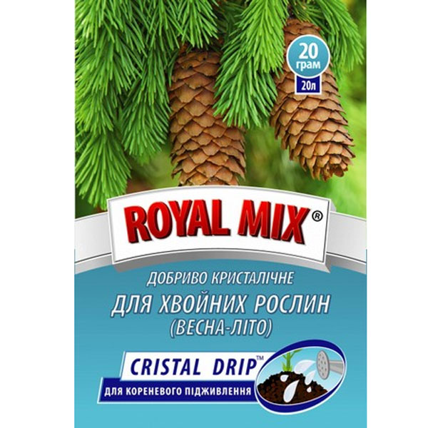 Комплексне кристалічне добриво для кореневого підживлення всіх видів хвойних та вічнозелених рослин. Завдяки ідеально підібраному складу добрива повністю забезпечує потребу рослин у поживних речовинах, сприяє швидкому відновленню, рівномірному зростанню, зміцненню кореневої системи після зимового періоду. Зміст мікроелементів підвищує імунітет рослин, запобігає пожовтіння, посилює яскравість та насиченість кольору хвої. Склад: N-16%, P2O5-12%, K2O-22%, Fe-0,07%, Zn-0,025%, Cu-0,01%. Приготування робочого розчину: 1 г добрива розчинити у 1 літрі води. У разі дефіциту елементів живлення (при хлорозі) концентрацію збільшити в 1,5 рази (1,5 г на 1 літр води). Для приготування робочого розчину бажано використовувати відстояну протягом доби або відфільтровану воду кімнатної температури. Це пов'язано з тим, що така вода корисніша для рослин.