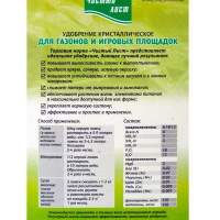 Високоефективне добриво для газонної трави. Стимулюють рівномірне зростання, підвищує витривалість до витоптування, заморозків, гнил, випревання і вимокання. Застосування добрива робить колір газону більш насиченим, трава набуває більш яскравого та насиченого забарвлення, а також повністю забезпечує потрібними речовинами для нормального харчування. Вага: 300 г. Склад: N 6, N03-N 3, NH4-N 3, P205 18, K2О 12, мікроелементи: MgO 2, Бор (В) 0,02, Залізо (Fe) 0,07, Марганець (Мn) 0,03, Цинк (Zn) 0,01, Мідь (Cu) 0,005, Молібден (Мо) 0,001, фітогармони 170 мг/кг, вітаміни 120 мг/кг. Для всіх типів газонної трави. Спосіб застосування: пачку концентрату розчинити на 450 л води. Період внесення: основне внесення – весна чи осінь, підживлення – весь вегетаційний період.