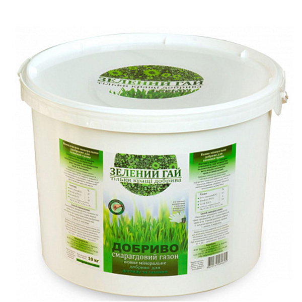 Добриво Зелений Гай Смарагдовий газон 10 кг - мінеральне добриво, яке використовується для всіх видів газонних трав. Підходить для всіх видів газонних трав з ранньої весни та все літо.