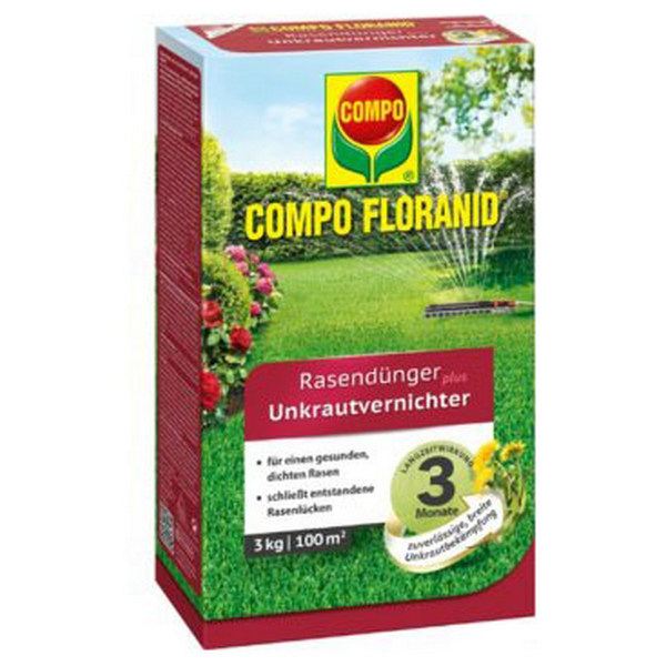 Тверде добриво Compo для газонів проти бур'янів містить усі поживні речовини для зеленого газону. Оптимальне поєднання гербіцидів та мікроелементів для усунення бур'янів. Спеціальна формула Floranid®. містить хімічну речовину дикамба (3,6-дихлор-2-метоксибензойна кислота C8H6Cl2O3), яка шкідлива для дводольних рослин, але не впливає на трави: знищує бур'яни, але не газон. Склад поживних речовин адаптований до запитів декоративного та спортивного газону та підвищує імунітет газону, а також зміцнює зелений колір газону. Оксид заліза у складі добрива запобігає утворенню моху на газоні. Склад: 15:5:8+3MgO+Fe. 15% загального азоту N: 7,8% амонійного азоту N, 2,2% нітратного азоту, 5% карбамідно-формальдегідного азоту, 4,5% оксиду фосфору (P2O5), 8% оксиду калію К2О, 0,3% заліза Fe 3% оксиду Магнію Mg2O.