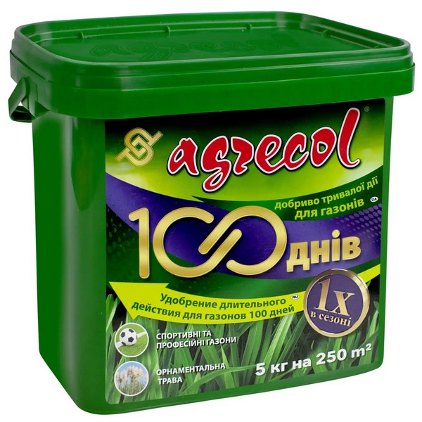 Спеціалізоване добриво швидкої та тривалої дії у формі гранул, 100 днів для газону, призначене для підживлення всіх видів газонних та декоративних трав, нових сіяних та рулонних газонів, покриву спортивних полів та полів для гольфу, а також усіх видів газонних поверхонь, що активно експлуатуються. Засіб можна використовувати на газонах як на сонячних, так і на затінених площах. Багатокомпонентне добриво Agrecol містить у складі азот (N) - 21%, фосфор (Р2О5) - 5%, калій (K2O) - 8%, магній (MgO) - 2%, бор (B) - 0.04%, мідь (Сu) – 0.1%, залізо (Fe) – 2%, марганець (Mn) – 0.17%, молібден (Мо) – 0.01%, цинк (Zn) – 0.035%. Збалансований склад даного засобу забезпечує комплексне живлення впродовж тривалого часу газонам, які інтенсивно експлуатують та часто підстригають. Комплексне добриво перешкоджає пожовтінню листя, сприяє зміцненню кореневої системи та приросту густої зеленої маси. В результаті газонне покриття стає рівномірно ущільненим і пишно-зеленим. Підживлення Agrekol стимулює обмін речовин у клітинах рослин, а також покращує синтез білків та хлорофілу. Пролонговане добриво 100 днів для газонів Агрекол ефективно застосовується для підживлення міскантусу, розплениці, вівсяниці, пампасних трав, шотландського моху, полевиці та багатьох інших декоративних газонних рослин.