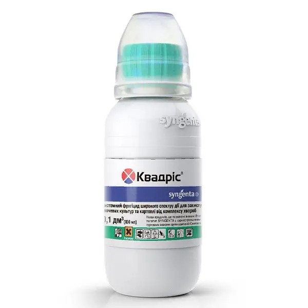 Фунгіцид Квадріс – системний препарат широкого спектру дії для захисту томатів, огірків, винограду, картоплі та ін. від комплексу хвороб. Сприяє підвищенню врожайності та покращує якість продукції, надає лікувально-профілактичну дію при боротьбі з різними захворюваннями переважної більшості сільськогосподарських культур.