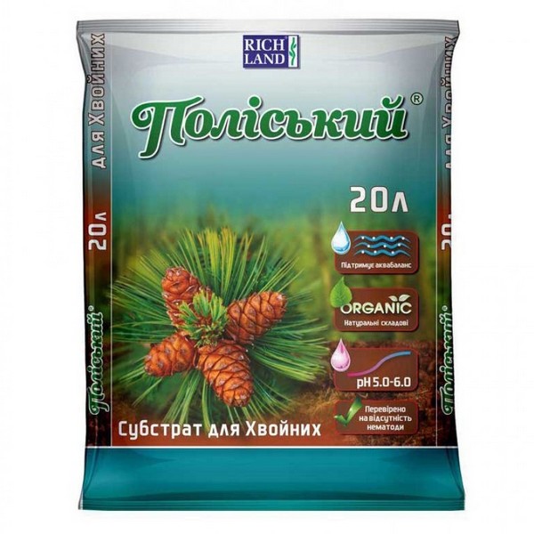 Субстрат "Поліський" - спеціальна суміш виготовлена на основі низинного торфу з добавкою глини та піску, для вирощування та постійного догляду за різними сортами дерев та чагарників хвойних порід (туя, ялівець, сосна тощо). Додавання глини та піску посилює аерацію суміші та розвиток кореневої системи хвойних рослин. Призначений для внесення під хвойні культури у відкритий ґрунт, а також для хвойних рослин, що вирощуються у зимових садах та будинках. Об'єм: 20л.