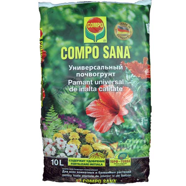 Використання: Compo Sana універсальна поставляється виробником вже готової до використання. Перед насипом рекомендується зробити дренаж, укладається субстрат за рівнем горщика або лунки. При посадці рослин і саджанців грунт суміш обов'язково зволожується і розпушується.