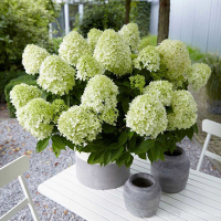 Гортензія хуртовина Літл Спукі - карликова гортензія висотою 50 см і шириною 30 см. Квітки зеленувато-білі, в куполоподібних суцвіттях. Цвітіння рясно, у липні-серпні. Кущ компактний, ідеально підходить для вирощування в контейнері на терасі та балконі. Місце сонячне або напівтінисте. Грунт вологий, дренований. Морозостійкість до -25 ?С. Дуже декоративна. У період цвітіння, кущ виглядає однією величезною квіткою зеленувато-білого кольору. Розташування та нирка: росте як на сонці, так і в півтіні. Віддає перевагу ґрунтам багатим гумусом, але пристосовується на будь-яких типах ґрунтів. Використання: Через сильну, компактну карликову форму ідеально підходить для горщика на терасі або балконі. Сорт хороший для змішаної посадки