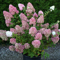 Гортензія мітловидна Сандей Фрейз - прекрасний рясно квітучий сорт, що утворює прямостоячий, дуже компактний, густий і рівний кущ до 1,5 м у висоту. Зацвітає широкопірамідальним суцвіттям спочатку білого кольору, пізніше, рожевий.пломбір. Досягає близько 1-1,5 м заввишки.
