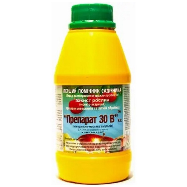 Препарат 30В – це сучасний, безпечний інсекто-аккарицид, адъювант-прилипач для боротьби з зимуючими стадіями шкідників плодово-ягідних та декоративних рослин, такими як: каліфорнійські щитівки, ложнощитівки, попелиці, листовійки, черевці, мідяниці, молі, кліщі і т.д.