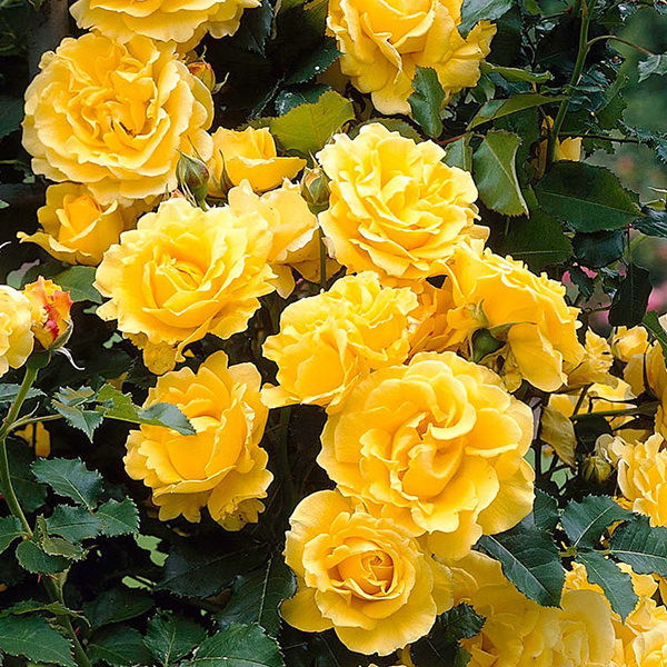 Квітки розкрившись золотисто-жовті, вигоряють до лимонних, іноді кремових. Вони напівмахрові, з хвилястими пелюстками та червоними тичинками у центрі – гарне поєднання. З'являються по одному або невеликих кистях на кінцях довгих пагонів, зазвичай по 3-5 шт. Після рясного першого цвітіння квітки з'являються по 1-2 шт. все літо, поки не настане друге рясніша цвітіння восени. Гарні у зрізанні. Пагони товсті, листя блискуче, яскраво-зелене, дещо схильне до чорної плямистості.