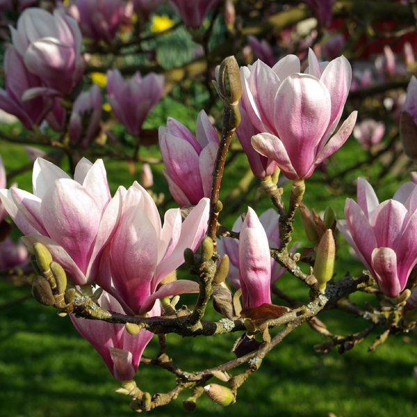 Магнолія суланжа (Magnolia soulangeana) - гібрид, отриманий шляхом запилення магнолії оголеної та лілієцвітної. Це 6-8-метрове дерево з пухкою кроною, що зазвичай починає розгалужуватися близько від землі. Листя зворотнояйцевидне або овальне, загострене на вершині і біля основи, довжиною 13-22 см, матово-зелене, зверху гладке, знизу опушене.