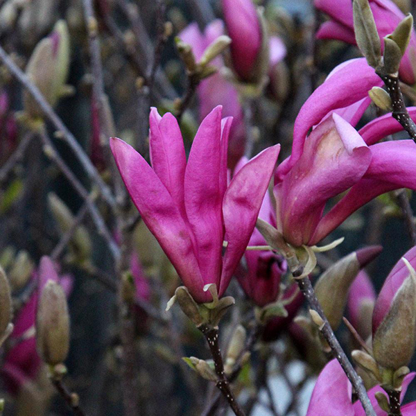 Магнолія Сьюзан (Magnolia Susan) - листяна, квітуча рослина з Магнолієвих. Існує безліч видів цього деревця. Шляхом старань учених сорт Сьюзан набув найширшого поширення серед садівників і просто любителів прекрасного. Форма: Молоді рослини схожі на конусоподібні чагарники. Залежно від умов утримання можуть набувати витягнутої форми, що не вважається відхиленням від норми. З віком набувають округлі обриси. Розмір: При правильному догляді деревце може досягати 3 - 3,5 метрів заввишки. Однак в умовах помірного клімату рідко виростають понад 2 метри. Зростає досить повільно, до 20 сантиметрів приросту на рік. Листяка: Пишна, росте пучками на зрілих гілках, розташовується хаотично. Сформовані листки досить великі по 10 см завдовжки. У теплу пору року темно-зеленого кольору, з похолоданням жовтіють. Коренева система: Добре розвинена. Коріння широко розгалужене, розташовується на поверхні. Рекомендації щодо посадки: Особливу увагу слід приділити ґрунту. На кислому та вологому ґрунті магнолія важче переносить зимівлю. Для відмінного зростання та розвитку в неглибоку посадкову яму потрібно додати добру частку піску та листя. Місце має бути захищеним від протягів та сильного вітру. Для успішного вкорінення краще вибрати південну сторону, а посадку робити навесні. Догляд: Крім багатого і частого поливу цій рослині нічого не потрібно. Мінеральні або комплексні добрива можна періодично використовувати для зміцнення, проте і без підживлення кущ добре цвістиме і розвиватиметься. Молоді саджанці на зиму покриваються подвійним шаром нетканого матеріалу. Дорослі дерева нормально переносять зиму самостійно. Особливості: У жодному разі землю навколо стовбура не можна перекопувати або утоптувати - це дуже шкодить корінням. Прикореневу зону важливо мульчувати щільним шаром листя. Враховуючи те, що крона може досягати 3 - 4 метрів завширшки, деревце повинне рости там, де йому буде достатньо місця. Використання в дизайні: Для домашніх садів і палісадників просто чудовий варіант. Відмінно виглядає як у квітковій клумбі, так і серед фруктових дерев. Висота рослини: 150-160 см