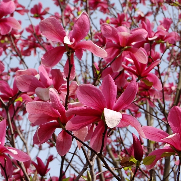 Магнолія Гелаксі (Magnolia Galaxy) - листопадне, невелике дерево, зазвичай одноствольне, або ж великий чагарник, крона в молодості колонноподібна, пізніше вертикальна конусоподібна, відрізняється швидким зростанням. Висотою 4-7 м, шириною 3-4 (5) м. Листя: Листя розташоване чергово, назад-яйцевидне, довжиною 15-22 см, шириною 8-11 см, темно-зелене, з нижньою сторони синювато-зелені. Цвітіння: Зацвітає до початку розпускання листя, нирки темно-рожево-червоні, квіти, що розпустилися, світліші, червонувато-пурпурні, усередині світло-рожеві, за формою нагадують тюльпан, довжиною до 20 см, пелюстки 11-12 см, зі слабким ароматом, цвіте із середини квітня до травня. Освітлення: Сонячне до легкої тіні. Грунт: Віддає перевагу гумусним, рівномірно свіжим або вологим, дуже пухким і добре проникним субстратам, від кислих до нейтральних. Використання: Магнолія Галаксі використовується як солітер. Прекрасно виглядає в алейних чи групових посадках. Завдяки високому вмісту ефірних олій, магнолія має високі цілющі властивості.