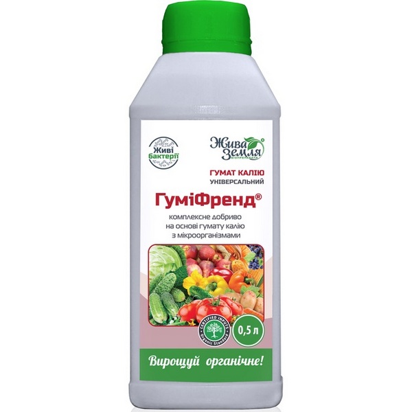 ГуміФренд – комплексне добриво на основі гумату калію з додатковим вмістом корисних мікроорганізмів та продуктів їх метаболізму. Безпечне для людей, бджіл, тварин.