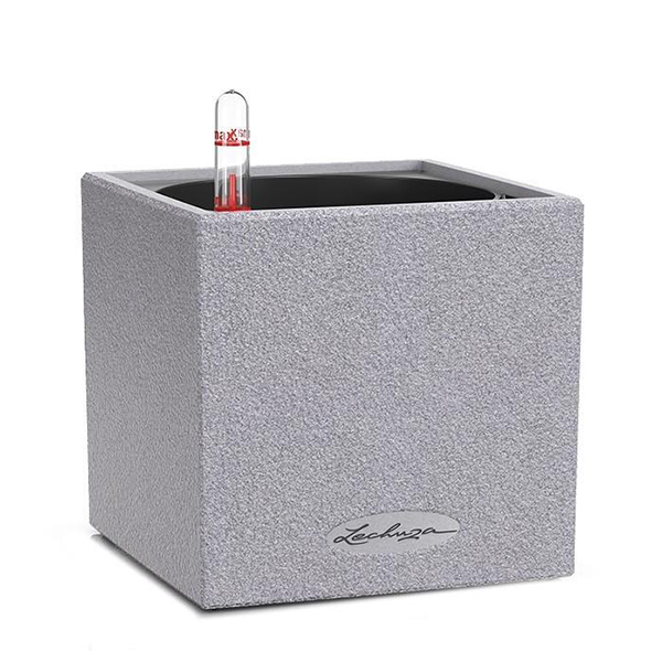 Вазон Lechuza Canto Stone із системою автополиву складається із зовнішнього кашпо, знімного посадкового горщика, дренажу та шахти для затоки води з індикатором рівня.