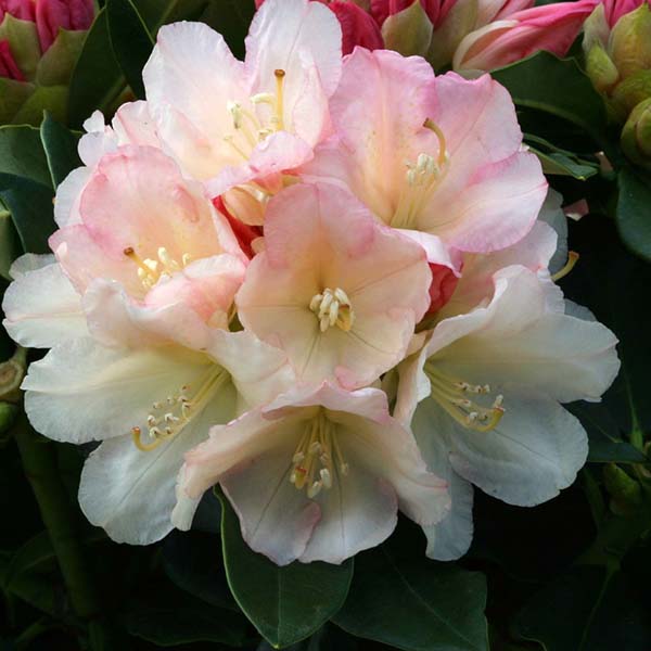 Rhododendron yakushimanum Golden Torch - вічнозелений, компактний, кущ, що повільно росте, кулястий. Листя темно-зелене, 7-9 см. Бутони рожеві, у розпуску жовті, що вигоряють до білого. Цвітіння щорічне дуже рясне та тривале. Потребує посадки в кислий (рН від 4,5 до 6,5), пухкий, добре дренований грунт, в захищених від вітру, напівтінистих місцях, не виносить перезволоження. Особливості посадки: Оскільки ця рослина любить півтінь, їй буде дуже комфортно під кроною дерев або високих чагарників. Грунт повинен бути з помірною кислотністю або взагалі слаболужний. Садити його краще в лунку або широку ямку, оскільки коріння цієї квітки має властивість розростатися. Головне стежити, щоб коренева шийка не йшла в ґрунт, так квітка не візьметься. У грунт можна додати перегною, якщо земля суха і неродюча, якщо вона волога і свіжа досить насипати трохи піску для утворення кисневих озер. Добрива: Дорослу рослину достатньо підгодовувати раз на місяць, для цього підійде розбавлене мінеральне добрива, краще суперфосфат у легкій концентрації. Також дуже сприятливо позначаються органічні речовини, які розведені у воді, перед поливом їх обов'язково добре відстояти. Молодим кущам тих же мінеральних та органічних складів потрібно вдвічі більше. Догляд: Кущі, що добре розрослися, обов'язково потрібно підрізати, для цього, гілки діаметром до 4 см. потрібно зрізати, а місце зрізу обробити масляною фарбою, для профілактики інфекцій. Для щорічного пишного цвітіння, старі суцвіття теж потрібно видаляти, то рослина замість однієї сухої нирки дасть 2-3 нові. Морозостійкість: Висока. Добре розвинені, кущі, що обрізають, зимують без додаткової допомоги при температурі до -30 градусів, завдяки чому вистоюють навіть суворі зими. Нещодавно посаджені кущики можна накрити сосновою хвоєю чи лапником. Перед зимівлею, до перших морозів рослину потрібно рясно полити. Розмноження: Насіння потрібно висадити в глибокий контейнер і накрити плівкою, для парникового ефекту, сіянці, що підросли, краще пересадити в теплицю до наступного року. У відкритий грунт можна садити саджанці, що добре сформувалися.