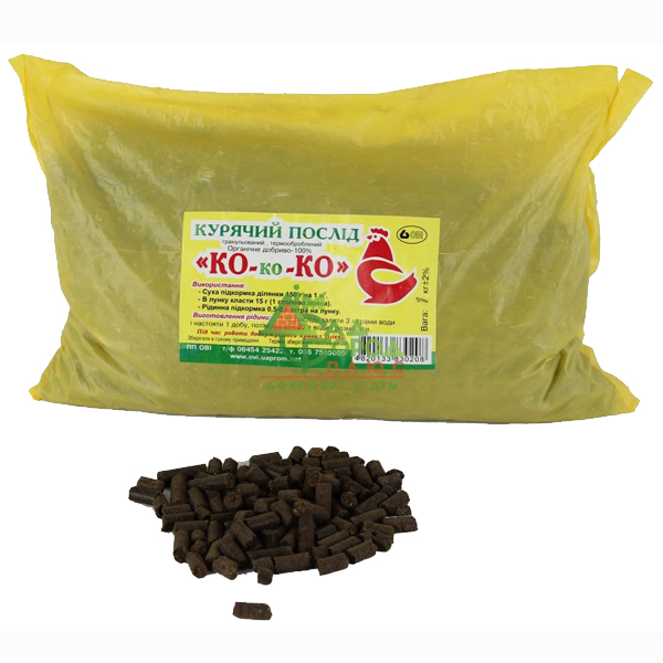 Помет курячий гранульований - повністю натуральне добриво для рослин відкритого та закритого ґрунту. Головною особливістю. Цим засобом є надзвичайно висока концентрація корисних речовин. У посліді свійської птиці відсотковий вміст азоту, магнію та калію в кілька разів вищий, ніж у спеціальних добавках. Вигляд: Органічне. Класифікація: Водорозчинне, гранульоване. Тип: Універсальне. Призначення: Послід курячий використовується для добрива сільськогосподарських культур (зернових, овочевих), плодових дерев та чагарників, квітучих та трав'янистих рослин. Азот покращує родючість ґрунту, забезпечує надійну профілактику його виснаження. Цей продукт життєдіяльності підвищує врожайність, запобігає розвитку різних видів хлорозів, а також грибкових захворювань, зміцнює кореневу систему. Застосування: Гранульована куряча послід одразу готова до використання. На відміну від свіжої речовини, цей продукт не обпалює листя та кореневі шийки рослин навіть за деякого перевищення концентрації. Для приготування поживної суміші на 10 літрів води береться 100 г посліду. Полив проводиться навколо лунок – заливати безпосередньо під коріння не рекомендується. Повторювати підживлення потрібно кожні 2 тижні з моменту появи 4 листочків і до кінця сезону. Склад: Курячий послід у гранулах. Вага: 1 кг. Країна Україна.