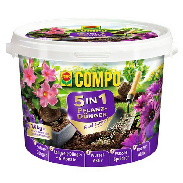 Добриво Compo 5 в 1 мікс для посадки рослин - знижує стрес і покращує стан рослини після пересадки. Багатий склад покращує існуючий ґрунт, покращує поглинання води, діє до 6 місяців. Склад: NPK 9+6+5