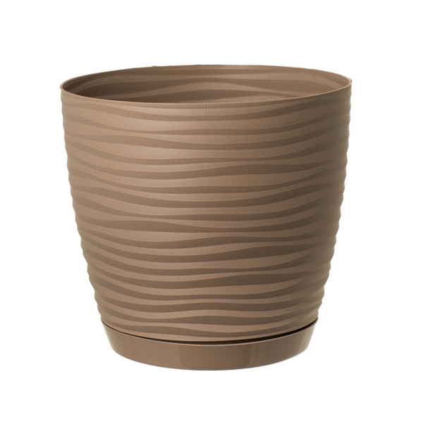 Горщик для квітів Sahara прикрашений хвилястими горизонтальними борозенками, що нагадують горбисті піски пустелі. Цей декоративний горщик для рослин майже такий самий гарний, як і традиційна кераміка, розписана вручну. Нейтральні, скромні кольори, які гармоніюватимуть із сучасним інтер'єром, лише додають йому чарівності. Виготовлений з товстого, виключно міцного пластику, стійкий до механічних пошкоджень та впливу сонячних променів та морозу. Його можна використовувати не тільки у приміщенні, але й на вулиці, не побоюючись поломки, втрати кольору чи якості. Піддон оснащений системою, що самоблокується. Колір: Бежево-сірий Діаметр: 11 см Висота: 10 см Об'єм: 0,65 л