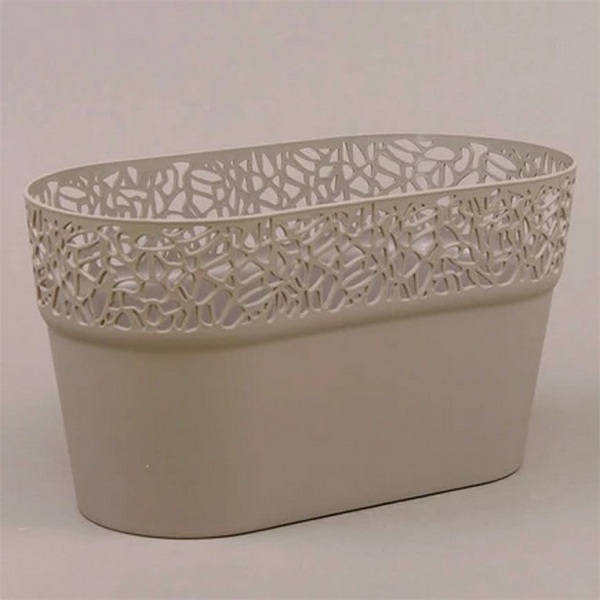Горщик овальної форми стане чудовим місцем для вирощування розсади, сукулентів, кімнатних квітів. Колір мокка ефектно відтінить зелень і цвітіння, яке здаватиметься ще яскравіше. Верхня частина вазону нагадує мереживо, а сам матеріал легко миється та не вигоряє на сонці.