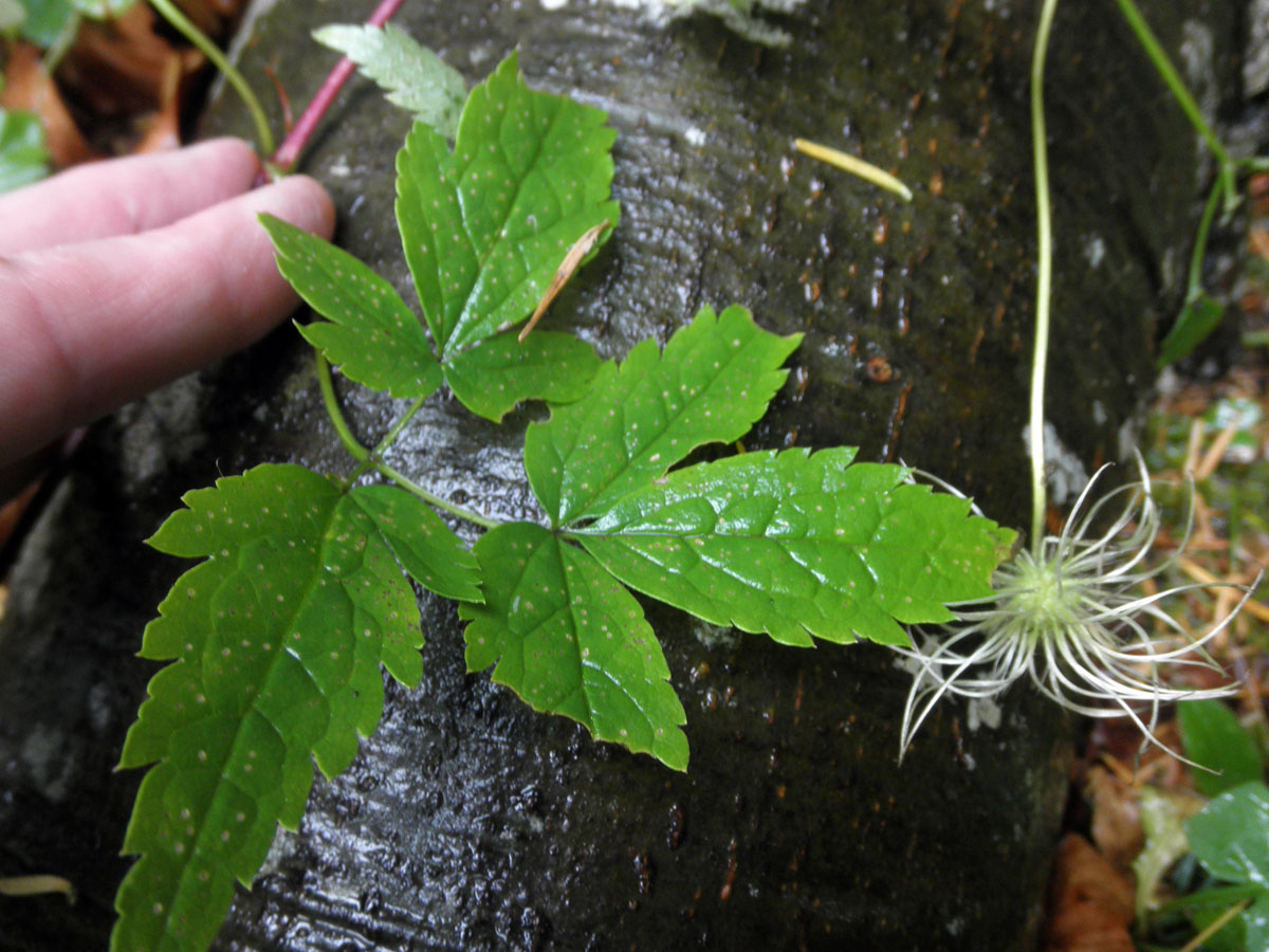 Листья на длинных черешках, тройчатые, яйцевидной формы, заостренные, глубоко-пильчатые. Верхняя сторона листовой пластинки голая, нижняя — слегка опушенная. Черешки 4-7 см в длину, часто с усиками. Листовая пластинка светло-зеленая, 2-7 см в длину и 1-3 см в ширину.