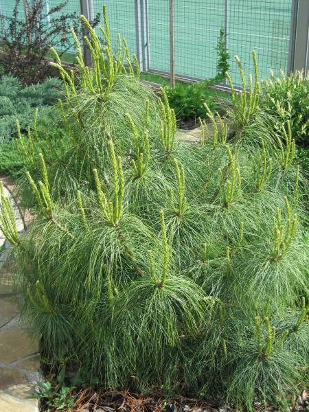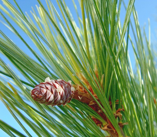 Хвоя собрана в пучки по 5 штук, тонкая, длинная (12-18 см), ширина 0,75 см, на молодых побегах вертикально стоящая, на более старых – свисающая вниз, острая, голубовато-зеленая (сизая), с белыми устьичными линиями с внутренней стороны, края мягко-спиленные. Сохраняется на дереве 3-4 года.