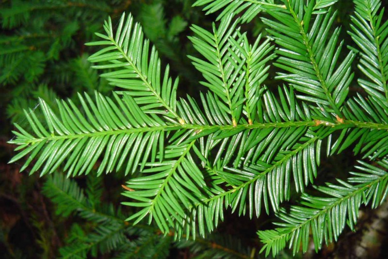 Хвоя 1-2,5 см в длину и 2 мм в ширину, сверху желтовато-зеленого цвета, снизу – светло-зеленая, плоская, слегка серповидно изогнутая, внезапно коротко заостренная, с едва выступающей средней жилкой, снизу с бледно-зелеными устьичными полосками, на коротких черешках. У основания хвоя длиннее, чем на верхушках. Зимой приобретает красноватый оттенок.