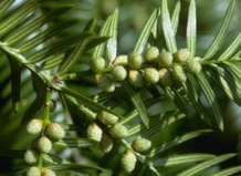Хвоя линейно-ланцетная, растет к побегам под углом 60-90°, блестящая, ярко-зеленая, (0.7-) 1,1-2,5 (- 4.5) см × 2-3,5 мм, снизу с 2 устьичными полосками (0,2-) 0,3-0,4 мм в ширину, с туповатым или округлым основанием, остроконечная. Черешок 0.5-1 мм.