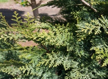 Хвоя чешуйчатая, зеленая, густая, плотно прилегает к ветвям. Молодая поросль мраморно-белая или белая, к зиме зеленеет.