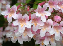 Цветки очень изящные, колокольчатой формы, до 1,5 см в длину, ароматные, растут на концах однолетних боковых побегов, собраны попарно в щитковидные соцветия. Цветоножки мохнатые, декоративные. Венчик колокольчатой формы, пятилопастный, снаружи розового цвета, внутри – желтоватый. Цветет очень обильно, так что не видно листьев, начиная с 5 лет, в течение 20-25 дней весной или летом.