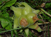 Плоды – небольшие орехи, собранные по 4-6 штук вместе. Обертка сильно бороздчатая, стянутая над верхом и выше рассеченная на вильчато-раздвоенные серповидно изогнутые, острые, зубчатые доли. Орехи яйцевидно-шаровидные, 1-1,5 см в диаметре. Плоды зреют в октябре. В условиях Украины не плодоносит.