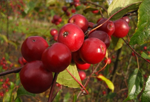 Плоды – небольшие яблочки, многочисленные, округлой формы, диаметром 2,5-3 мм, на среднем по длине черенке (2-3 см), красные, с затемненной стороны иногда оранжевые или желтые, съедобные. Плодоносит обильно и регулярно. Плоды сохраняются на дереве до октября-ноября.