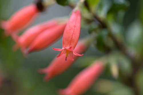 Листья обратнояйцевдные, до 3 см дилной, 1,2 см шириной, в верхней части по краям пильчатые, плотные, глянцевитые, зеленые. Цветки по одному или по два, пазушные, длиной до 2,5 см, цилиндрические, ярко-красные. Цветение обычно наступает с марта по май, цветет обильно в течении двух месяцев.