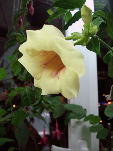 Моя любимая алламанда. Рядом видны цветы фуксии. Если присмотреться, можно заметить веточки баухиний двух видов и слева побег барлерии.