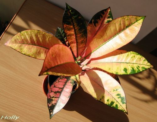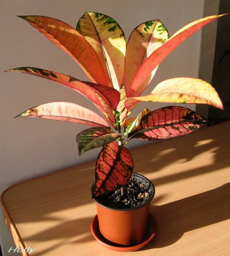 Они у вас хорошенькие!!! У моей сестры был огроменный горшок с различными кротончиками (самый большой достиг 1,5 метра), в том числе и таким, как у Вас новенький(он в этом горшке образовал большущие заросли). И как-то на них напали мучнистые червецы. В то время сестричка была кормящей мамочкой и не могла себе позволить прибегнуть к ядохимикатам, да и времени на лечение отсутствовало. А я тогда тоже еще не занималась цветами и понятия не имела даже о малейших принципах ухода за ними. Так эти кротончики и страдали до тех пор, пока я не набралась опыта и решилась взяться за их выздоровление. Вобщем, в итоге, удалось спасти только великана. Зато сейчас, мне так приятно осознавать, что мне удалось спасти такого красавца!!