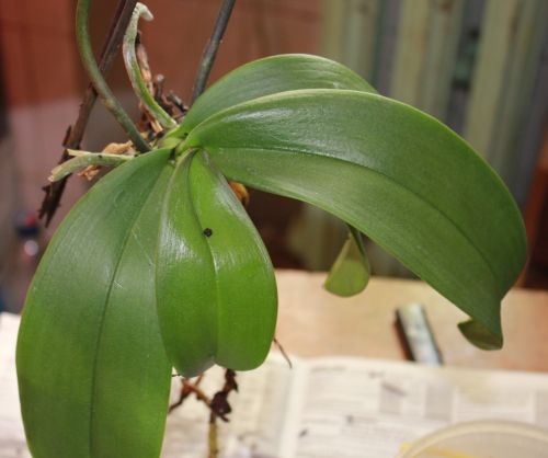 Вот это листья моей орхидеи.Маленький листочек засохнул и отпал.На листьях какието засохшие точечки...