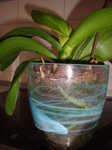 Подарили на 8-е мне цветущею орхидею, я её ещё не поливала, на вид она так ничего, но на горшке в нутри зелёный налёт It is surprised, и корни сверху начинают сохнуть!? поливать не хотела так как меня пугают эти ВОДРОСЛИ It is surprised, и корни в горшке какого-то не здорового зелёного цвета.... как быть с ней??????????????