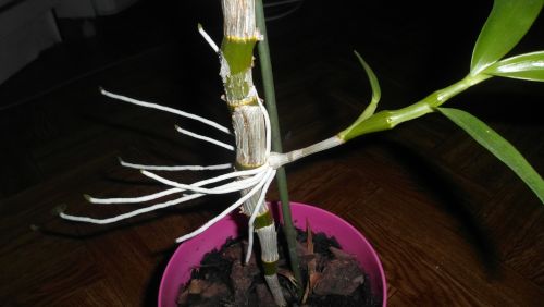 Моему дендробиуму уже больше 1.5 года.Как цветочки опали,так и больше не цветет.На стволах появляются (незнаю как это называется)как отросточки с корнями,но корни какие то неживые,мягкие и как пустые.И я незнаю что делать с этими отросточками,обрезать и рассадить или пусть так растет,но их появляется много.Один я разделила и пересадила,так ини какие то вяленькие стоят.И как это называется,помогите пожалуйста!