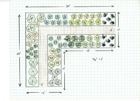 Предлагаемый сад многолетних растений расположен на угловой клумбе, площадь которой составляет приблизительно 36 кв.м. Вы можете использовать его как план посадки или выбрать цветы для посадки в свободные места вашего сада.