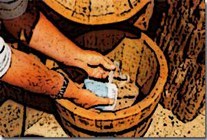 Если струя, стекающая из верхнего бочонка, не очень ровная, то можно прорезать в нем небольшой желоб для лучшего стока.