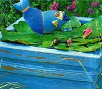 Чтобы вашего "водяного" не "затянули" водоросли, посадите в мини-водоем растения: водяной гиацинт (Eichornia), турчу (Hottonia), плавающий на поверхности воды крошечный папоротник (Azolla) и водяной салат, или пистию (Pistia).