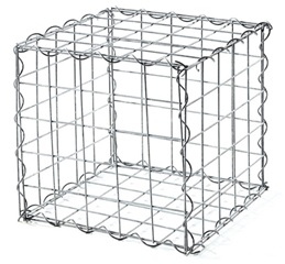 Каркас габиона состоит из сваренной металлической сетки, которая изготавливается из проволоки диаметром 3,5 – 6 мм с цинк-алюминиевым покрытием для защиты от коррозии. Благодаря этому габионные конструкции имеют длительный срок службы и сохраняют свой эстетический вид. Со временем материал может слегка потемнеть. Размер ячеек сетки может быть разным: от 40х40 мм до 100х100 мм – в зависимости от размера наполнителя. Главное, чтобы размер элемента наполнителя был больше размера ячеек сетки. На сегодняшний день в продаже есть садовые габионные каркасы из сетки с дополнительным ПВХ-покрытием, что позволяет габиону сохранить целостность в агресивной среде.