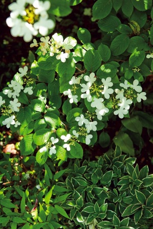 На фотографии: Тенелюбивые: геллеберус (Helleborus niger); фиалки (Viola odorata «Белый царь» ('White Czar')); ясменник душистый (Galium odoratum) и белая дицентра великолепная (Dicentra formosa 'Alba').