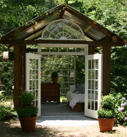 Следующий садовый домик создан по проекту американского дизайнера Алекса Виндхема (Alex Wyndham). Он построен из древесины американских пород красного дерева и совмещает в себе элементы как современного, так и деревенского дизайна. Его размеры - 2,1 x 2,7м. Дом интересен еще и тем, что покрытие крыши составляет искусственный газон и живые полевые цветы. Три из четырех стен могут открываться, что позволяет наполнить дом теплыми летними вечерами свежим воздухом и приятными ароматами сада. Итак, вот такой оригинальный садовый домик может послужить гостиной под открытым небом для приятного времяпрепровождения на свежем воздухе.