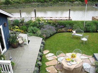 Важен не только дизайн садового домика, но и ландшафт, а также окружающее его пространство. В нашем случае у домика есть небольшая терраса, которая соединена с причалом для лодки хозяина. Не менее впечатляющим является разнообразие пышной растительности, которая высажена вокруг дома, а также две больших цветочных композиции в кадках у входной двери. Это придает домику еще более привлекательный вид.