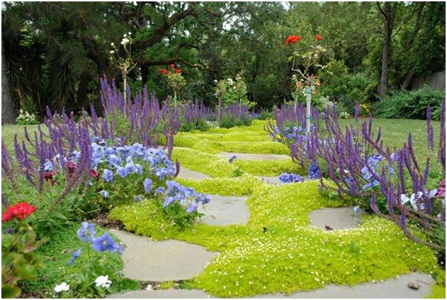 Почвопокровные как связующее звено. Почвопокровные обладают уникальной способностью объединять разрозненные элементы в саду. Эта композиция из шалфея, анютиных глазок и штамбовых роз рассматривается как единое целое именно благодаря светло-зеленому «коврику». Без него чувство порядка не было бы напрочь. Кроме того, он добавляет текстуру и притягивает взгляд сквозь пространство, вдохновляя откровенно детский интерес.